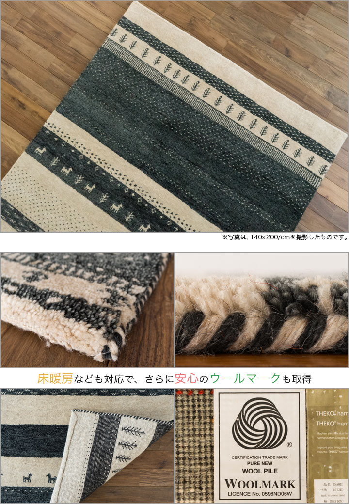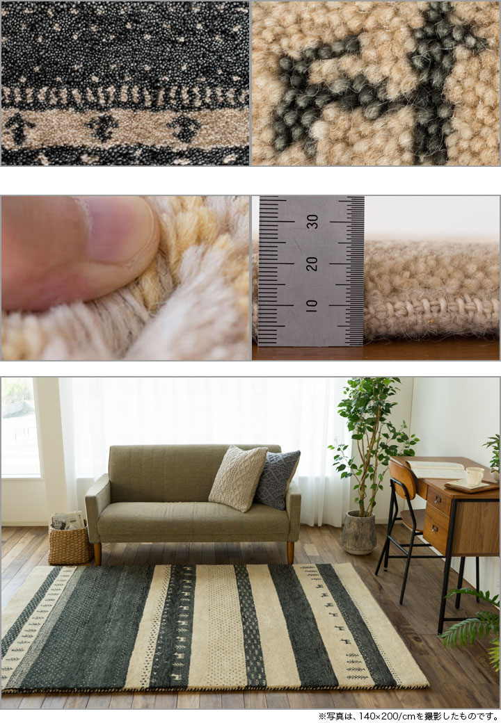 パイル組成 ウール100%(ウールマーク付き) 組成表示 ウール70% 綿30% (綿は縦糸と横糸に使用しています) 厚み パイル長 約16ミリ 全厚 約25ミリ 原産国 インド カラー ベージュボーダー(blu) ※商品によりサイズに多少の誤差があります。